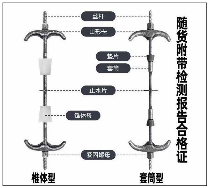 主营: m12-18三段式止水螺杆、穿墙丝、可定制法兰母、椎体母、山型母、山型卡