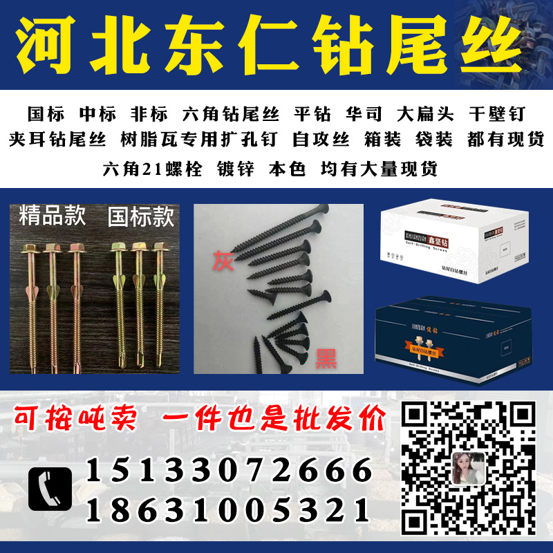 主营产品1:国标钻尾丝 中标钻尾丝 非标钻尾丝 六角头钻尾丝 平头钻尾丝 华司钻尾丝 沉头钻尾丝 自攻丝 六角钻尾钉 六角燕尾丝 燕尾钉 六角钉 平头十字钻尾钉 平头燕尾丝 大扁头钻尾丝 高强度干壁钉 磷化干壁钉 干壁钉 夹耳钻尾丝 树脂瓦扩孔钉 箱装钻尾丝 袋装钻尾丝 沉头螺钉 平头螺钉 大扁头钻尾螺钉 沉头螺钉 平头螺钉 大扁头钻尾螺钉 彩钢瓦配件 复合垫 酒杯垫 扩孔钉 双耳钉 树脂瓦专用钉 彩钢瓦钉 不锈钢钻尾丝 尼龙头钻尾丝 都有现货