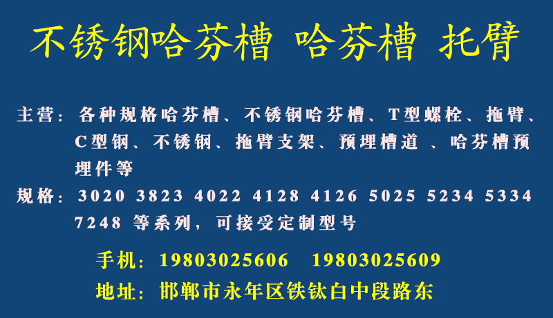 主营:各种规格哈芬槽、不锈钢哈芬槽、T型螺栓、拖臂、C型钢、不锈钢、拖臂支架、预埋槽道 、哈芬槽预埋件等