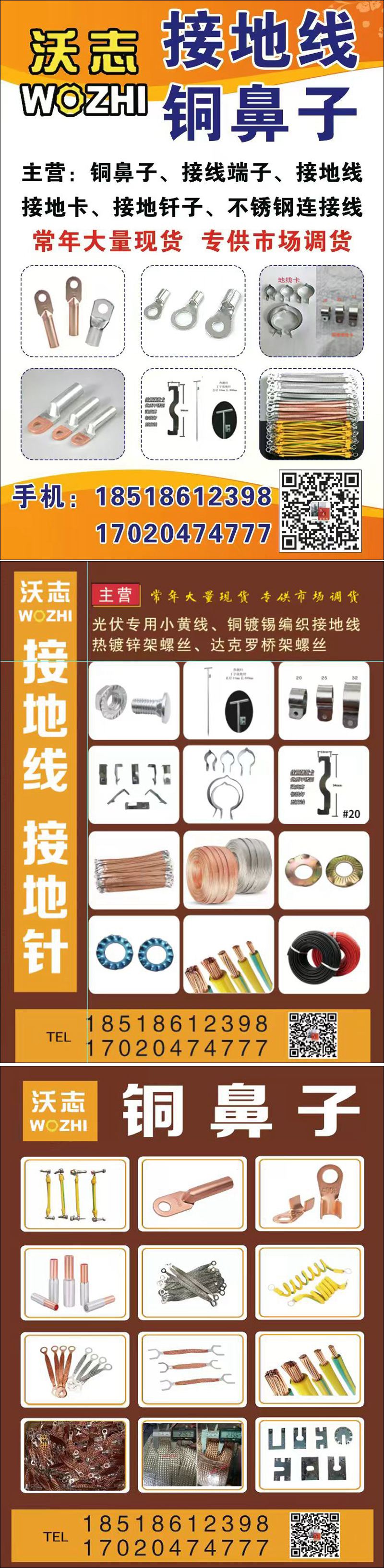 自产自销:光伏 电力器材,铜鼻子、SC、DT、RV、插针、c45、热缩管五指套、幕墙接地线、法兰接地线、 接地卡、接地针、光伏直流线、光伏导电片、光伏接地线、双色接地线、编织接地线、桥架螺丝、接地端子、不锈钢连接线、高铁 隧型 路基型接地端子、高铁连接线、不锈钢防盗螺丝、七字扣、免焊扣、接地垫、拉爆、丝杆、一体钉、三角牙螺丝、螺母、铜包铜、铜包铝、铜包锡,五指套,热缩终端,冷 热缩管,2.5平方到50平方之间都可定做双色线/打圈线。缠绕膜