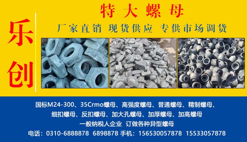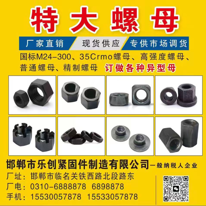 主营:国标M24-300、35Crmo螺母、高强螺母、普通六角螺母、精制螺帽、细扣螺帽、反扣螺帽、加大孔螺帽、加厚螺帽、加高螺帽、高强度螺帽、高强螺帽