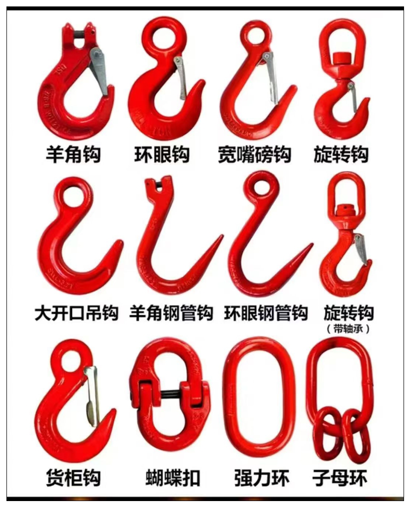 PDB平吊、Lc-吊、DFM翻转吊、DHQ-L吊、模锻L吊、CDH竖吊、羊角钩、环眼钩、宽嘴磅钩、旋转钩、大开口吊钩、羊角钢管钩、环眼钢管钩、旋转钩(带轴承)、货柜钩、蝴蝶扣、强力环、子母环、美式花兰螺栓、弓形卸扣
