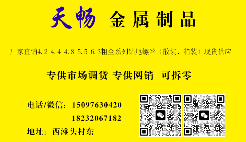主营:六角钻尾螺丝、华司钻尾螺丝、沉头钻尾螺丝、尼龙头钻尾螺丝、不锈钢钻尾螺丝