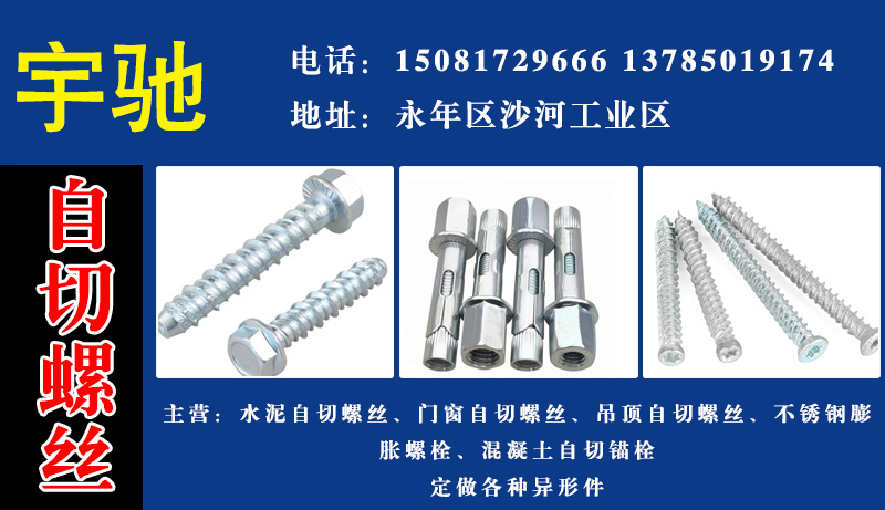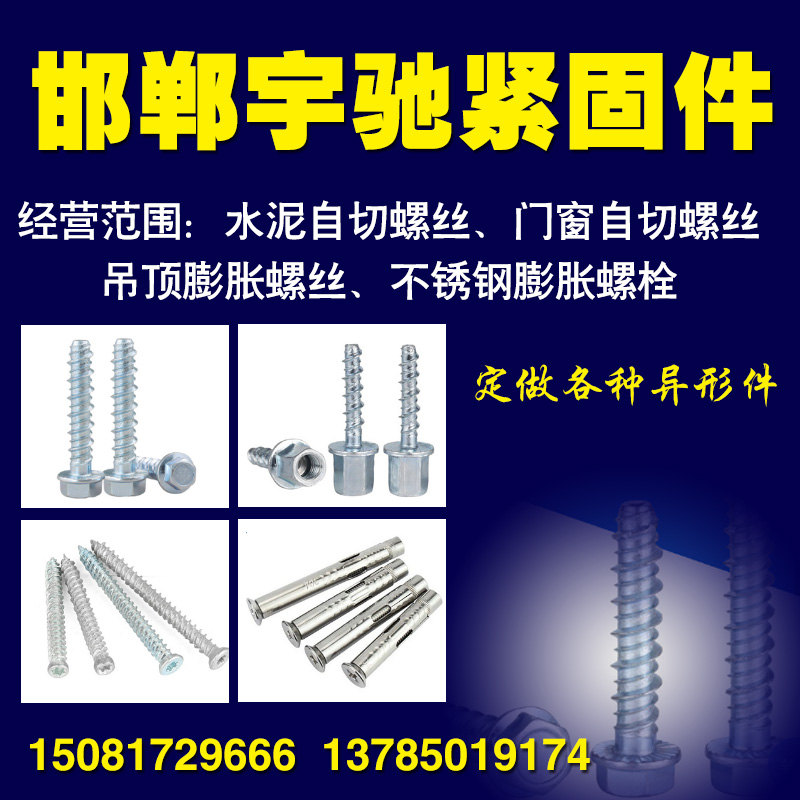 邯郸宇驰紧固件 主营:水泥自切螺丝、门窗自切螺丝、吊顶自切螺丝、不锈钢膨胀螺栓、混凝土自切锚栓 定做各种异形件 电话:15081729666 13785019174 地址:永年区沙河工业区