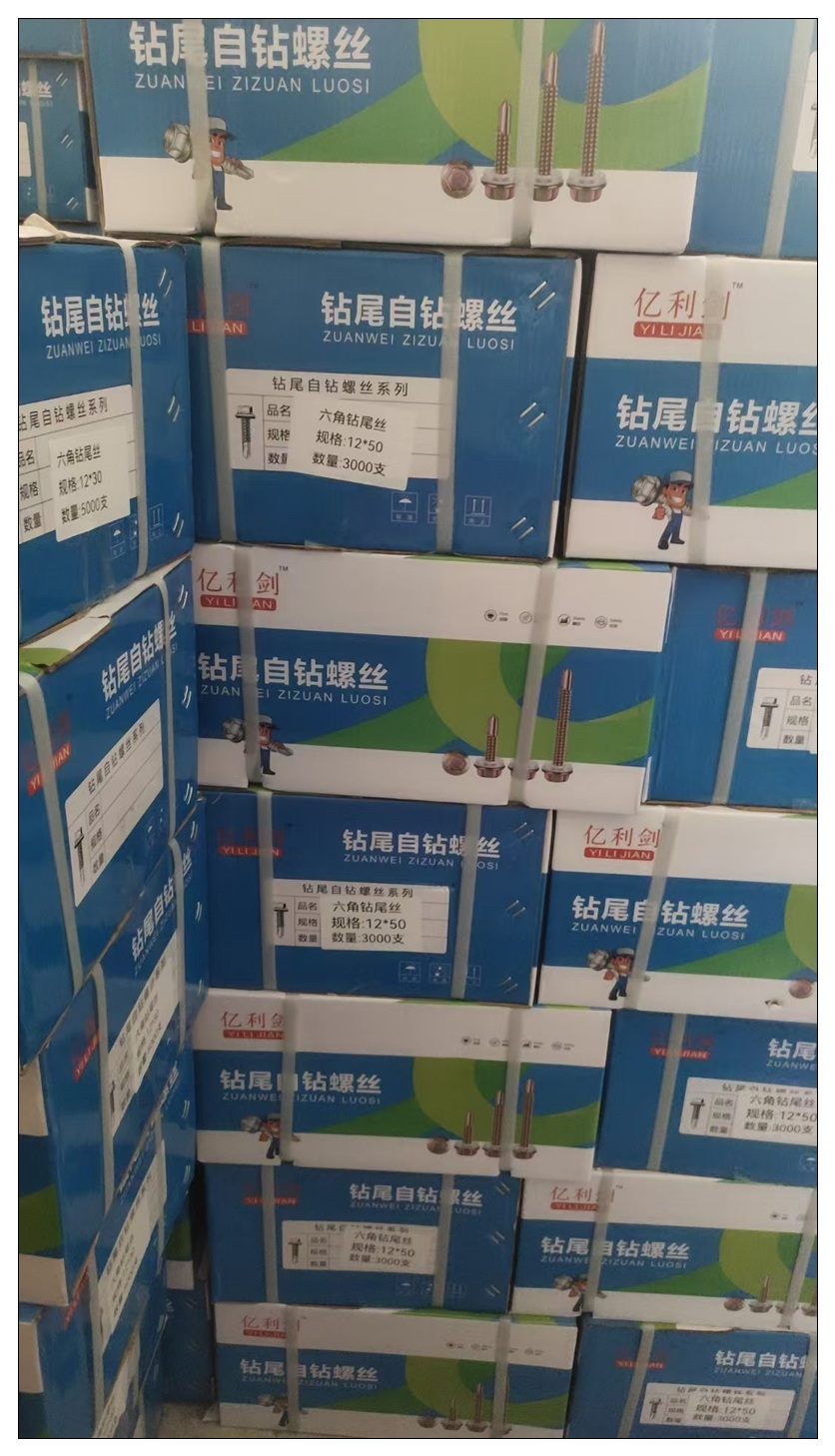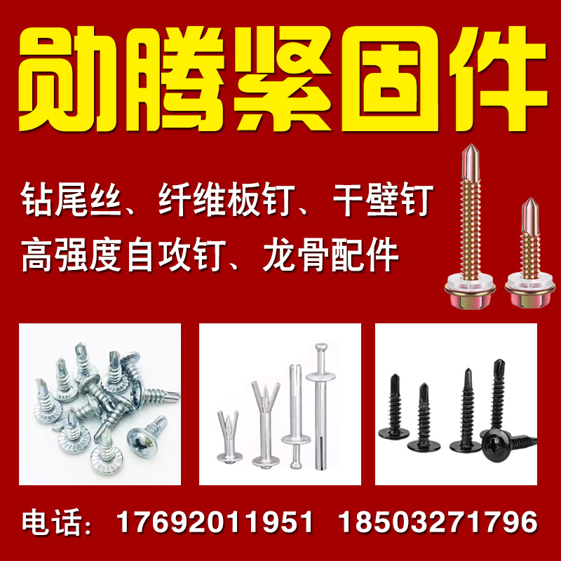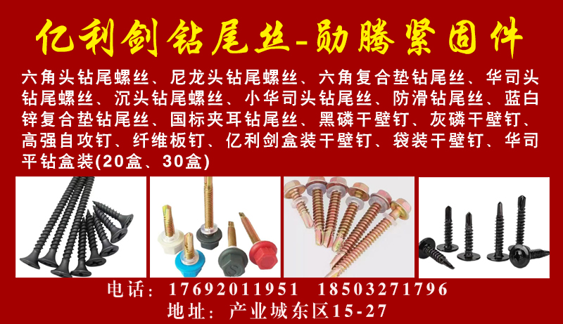 主营:六角头钻尾螺丝、尼龙头钻尾螺丝、六角复合垫钻尾丝、华司头钻尾螺丝、沉头钻尾螺丝、小华司头钻尾丝、防滑钻尾丝、蓝白锌复合垫钻尾丝、国标夹耳钻尾丝、黑磷干壁钉、灰磷干壁钉、高强自攻钉、纤维板钉、亿利剑盒装干壁钉、袋装干壁钉、华司平钻盒装(20盒、30盒)