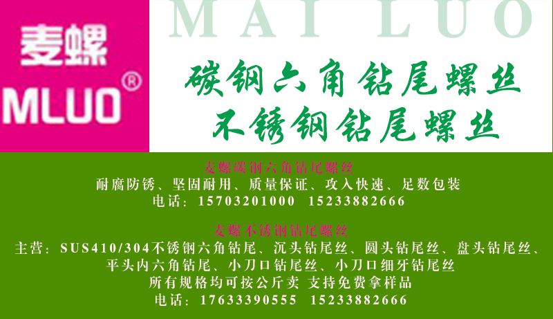 主营:SUS410/304不锈钢六角钻尾、沉头钻尾丝、圆头钻尾丝、盘头钻尾丝、平头内六角钻尾、小刀口钻尾丝、小刀口细牙钻尾丝