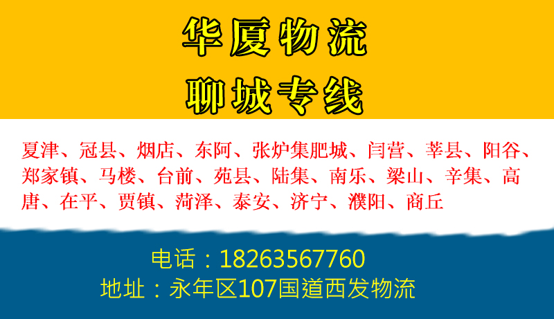 聊城专线:夏津、冠县、烟店、东阿、张炉集肥城、闫营、莘县、阳谷、郑家镇、马楼、台前、苑县、陆集、南乐、梁山、辛集、高唐、在平、贾镇、菏泽、泰安、济宁、濮阳、商丘 电话:18263567760 17631968035