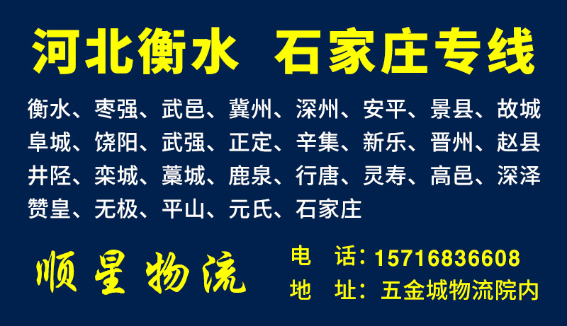 衡水、枣强、武邑、冀州、深州、安平、景县、故城、阜城、饶阳、武强、石家庄、正定、辛集、新乐、晋州、赵县、井陉、栾城、藁城、鹿泉、行唐、灵寿、高邑、深泽、赞皇、无极、平山、元氏 电话:15716836608 地址:五金城物流院内