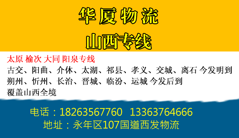 太原 榆次 大同 阳泉专线 古交、阳曲、介休、太湖、祁县、孝义、交城、离石 今发明到 朔州、忻州、长治、晋城、临汾、运城 今发后到 覆盖山西全境 电话:18263567760 13363764666