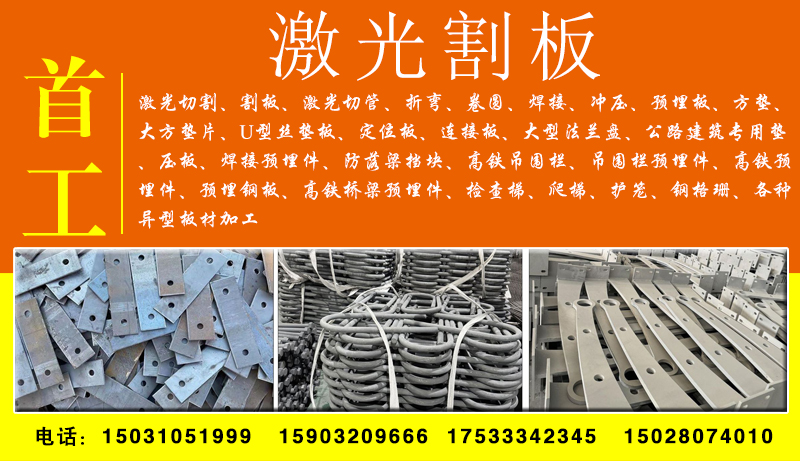 主营:激光切割、割板、激光切管、折弯、卷圆、焊接、冲压、预埋板、方垫、大方垫片、U型丝垫板、定位板、连接板、大型法兰盘、公路建筑专用垫、压板、焊接预埋件、防落梁挡块、高铁吊围栏、吊围栏预埋件、高铁预埋件、预埋钢板、高铁桥梁预埋件、检查梯、爬梯、护笼、钢格珊、各种异型板材加工