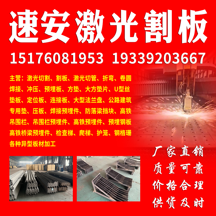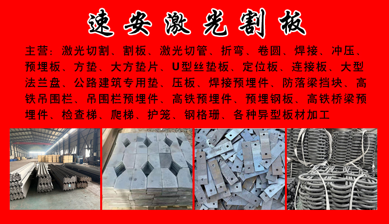 主营:激光切割、割板、激光切管、折弯、卷圆、焊接、冲压、预埋板、方垫、大方垫片、U型丝垫板、定位板、连接板、大型法兰盘、公路建筑专用垫、压板、焊接预埋件、防落梁挡块、高铁吊围栏、吊围栏预埋件、高铁预埋件、预埋钢板、高铁桥梁预埋件、检查梯、爬梯、护笼、钢格珊、各种异型板材加工