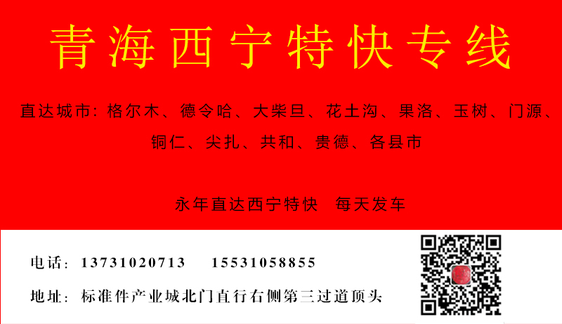 青海西宁特快专线 直达城市: 格尔木、德令哈、大柴旦、花土沟、果洛、玉树、门源、铜仁、尖扎、共和、贵德、各县市 永年直达西宁特快 每天发车 电话:13731020713 15531058855 地址:标准件产业城北门直行右侧第三过道顶头