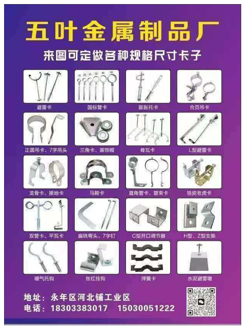 主营:避雷卡、国标管卡、膨胀托卡、龙骨卡、L型避雷卡、7字吊头、骑马卡、正圆吊卡、双管卡、避雷卡、平瓦卡、弹簧卡、管束卡、合页吊卡、 三角卡、装饰帽、脊瓦卡、直角管卡、铁皮老虎卡、扁铁弯头、 C型开口调节器、H型、Z型支架、暖气托钩、丝杠挂钩、7字钉、水泥避雷墩