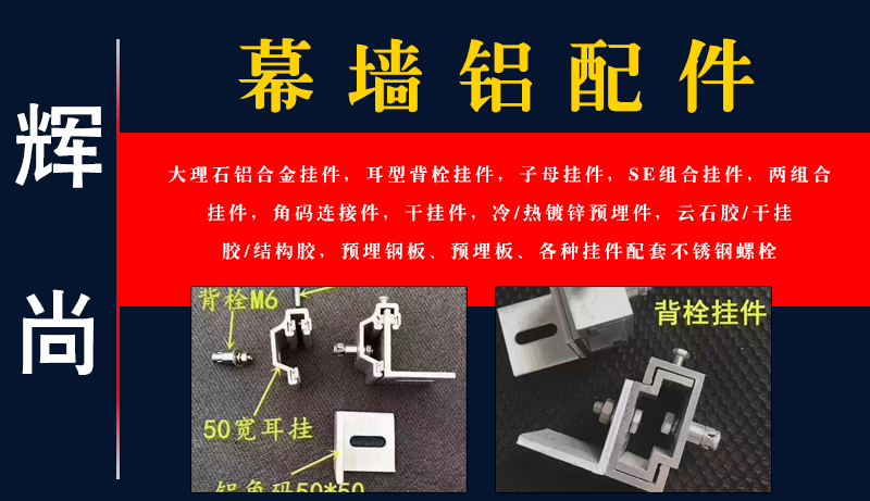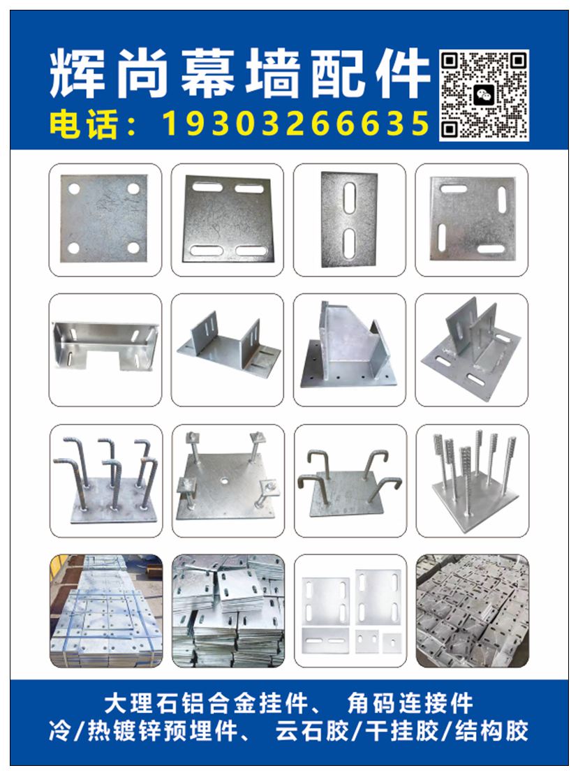 本公司主营:大理石铝合金挂件,耳型背栓挂件,子母挂件,SE组合挂件,两组合挂件,角码连接件,干挂件,冷/热镀锌预埋件,云石胶/干挂胶/结构胶,预埋钢板、预埋板、各种挂件配套不锈钢螺栓