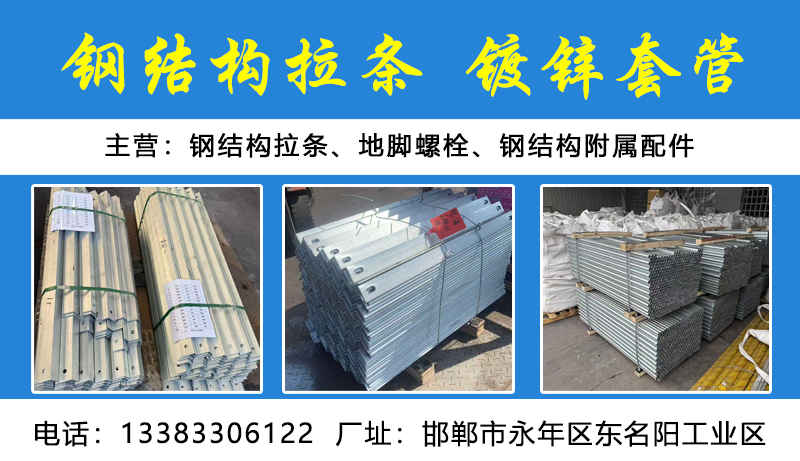 主营:钢结构拉条、地脚螺丝、锚板地脚,特大双头,特大高强度双头,钢结构附属配件、镀锌拉条、镀锌套管、直拉条、斜拉条、 热镀锌拉条、 光伏拉条