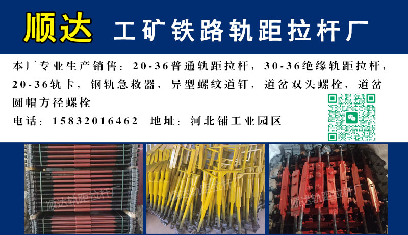 本厂专业生产销售:20-36普通轨距拉杆,30-36绝缘轨距拉杆,20-36轨卡,钢轨急救器,异型螺纹道钉,道岔双头螺栓,道岔圆帽方径螺栓、钢轨无孔夹具、预埋燕尾丝