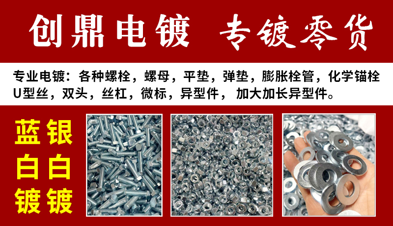 专业电镀:各种螺丝,螺母,平垫,弹垫,膨胀栓管,化学锚栓, U型丝,双头,丝杠,铆螺母 三组合 家具丝 ,异型件, 加大加长异型件/挂镀异型