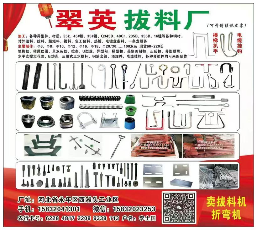 主要制作地脚螺栓,单双头丝,丝杠、正反扣、拉条,斜拉条、U型丝,方u型丝、异型勾,穿墙丝、伞把地脚、焊板地脚、梯型扣、英制美制扣,水平支撑,E型销,三段式止水螺杆,钢筋套筒,预埋件,水平支撑、电缆挂钩,地脚现货、各种异型件均可来图制作(可接出口货)