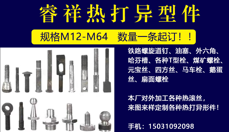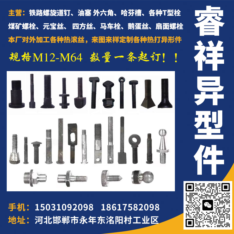 主营产品:铁路螺旋道钉、油塞、外六角、哈芬槽、各种T型栓、煤矿螺栓、元宝丝、四方丝、马车栓、鹅蛋丝、扇面螺栓