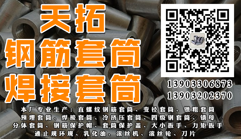 本厂专业生产:直螺纹钢筋套筒、焊接套筒、变径套筒、预埋套筒、T63套筒、冷挤压套筒、四级钢套筒、镦粗套筒、锁母、分体套筒、钢筋保护帽、套筒保护盖、大小扳手、力矩扳手、通止规环规、乳化油、滚丝机、滚丝轮、刀片