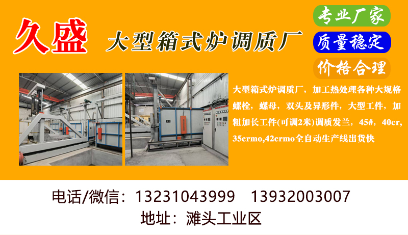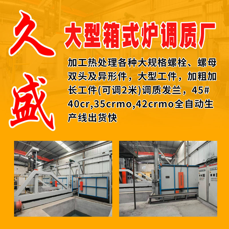 主营:大型箱式炉调质厂,加工热处理各种大规格螺栓,螺母,双头及异形件,大型工件,加粗加长工件(可调2米)调质发兰,45#,40cr,35crmo,42crmo全自动生产线出货快
