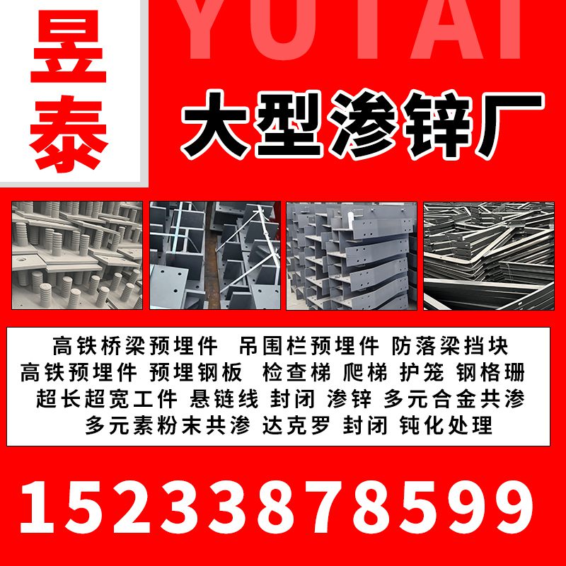 高铁桥梁预埋件 吊围栏预埋件 防落梁挡块 高铁预埋件 预埋钢板 检查梯 爬梯 护笼 钢格珊 超长超宽工件 悬链线 封闭 渗锌 多元合金共渗 多元素粉末共渗 达克罗 封闭 钝化处理,