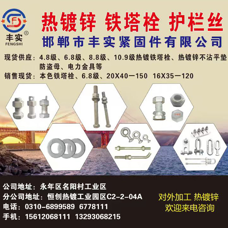现货供应:4.8级、6.8级、8.8级、10.9级热镀锌铁塔栓、热镀锌不沾平垫、防盗母、电力金具等