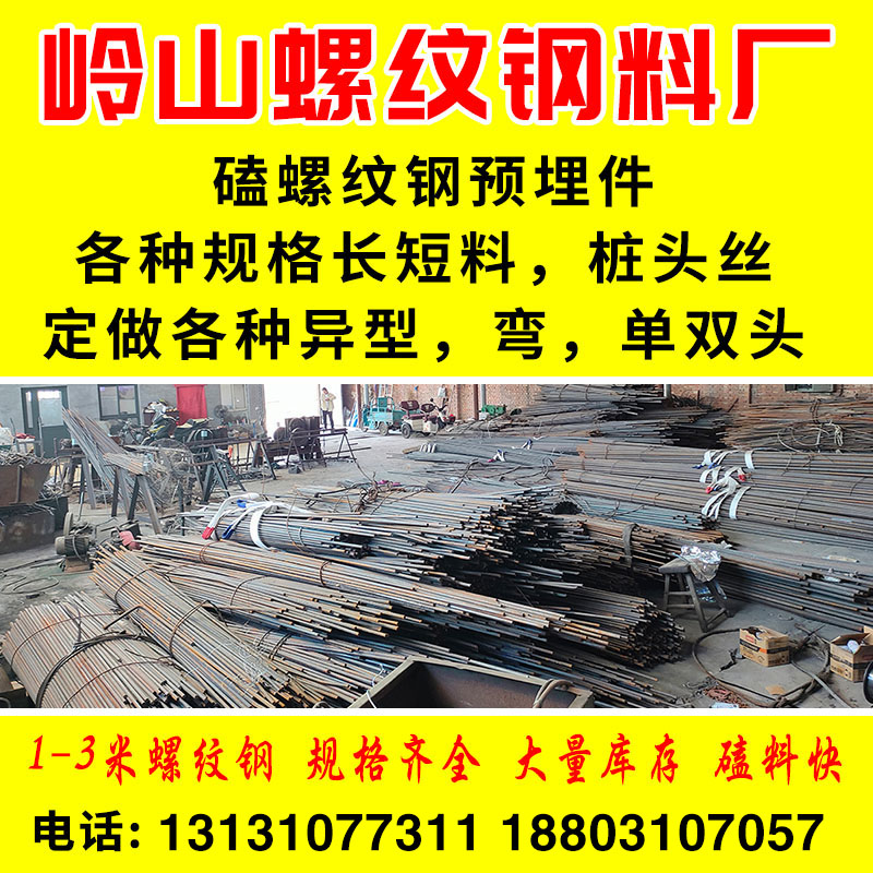 主营: 磕螺纹钢预埋件,各种规格长短料,桩头丝,定做各种异形螺纹钢,弯,单双头。