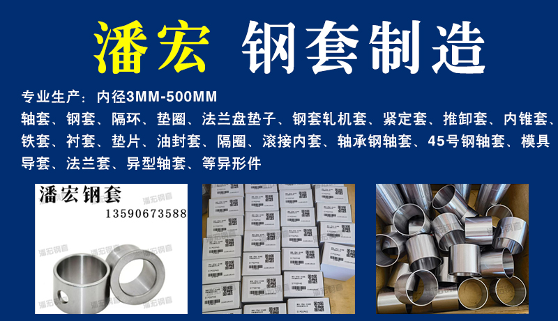 轴套、钢套、隔环、垫圈、法兰盘垫子、钢套轧机套、紧定套、推卸套、内锥套、铁套、衬套、垫片、油封套、隔圈、滚接内套、轴承钢轴套、45号钢轴套、模具导套、法兰套、异型轴套、等异形件