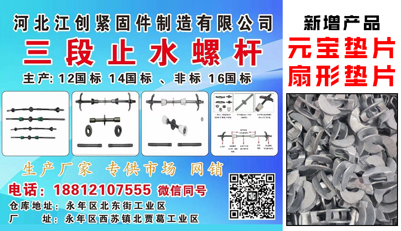 主产:三段止水螺杆 12国标三段止水螺杆;14国标三段止水螺杆、14非标三段止水螺杆;16国标三段止水螺杆 三段式止水螺杆 止水螺丝 高强度大六角螺栓 钢结构螺栓 扭剪螺丝 钢结构扭剪型螺栓 10.9级螺栓 10.9螺栓 10.9钢结构大六角 穿墙丝 穿墙螺丝 梯形扣丝杠 建筑配件 建筑穿墙螺丝 穿墙螺杆 止水钢板 钢板止水带 建筑止水板 塑料椎体螺母 山形卡 山形母 山型卡 山型母
