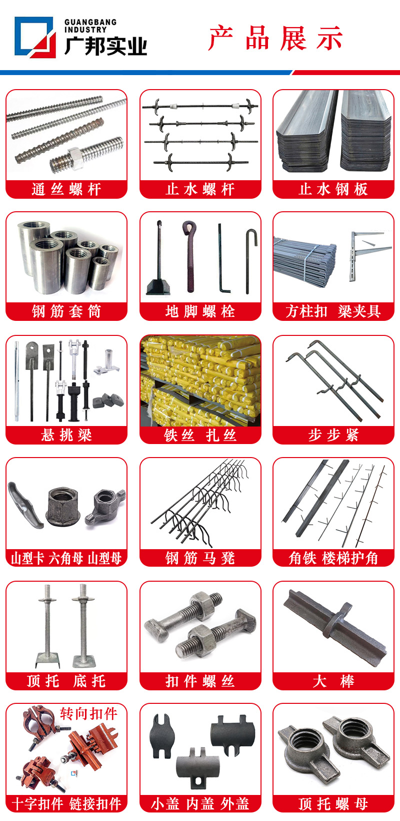 专业生产:通丝螺杆、三段止水螺杆、止水螺杆、地脚螺栓、方柱扣、梁夹具、悬挑梁、步步紧、山型卡、六角母、山型母、钢筋马镫、角铁/楼梯护角、顶托、底托、扣件螺丝、大棒、十字扣件、连接扣件、转向扣件、小盖、内盖、外盖、顶托螺母、铁钉、扎丝