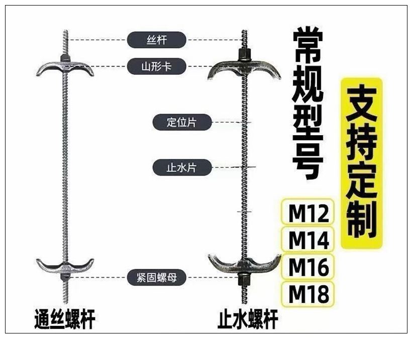 主营: m12-18三段式止水螺杆、穿墙丝、可定制法兰母、椎体母、山型母、山型卡