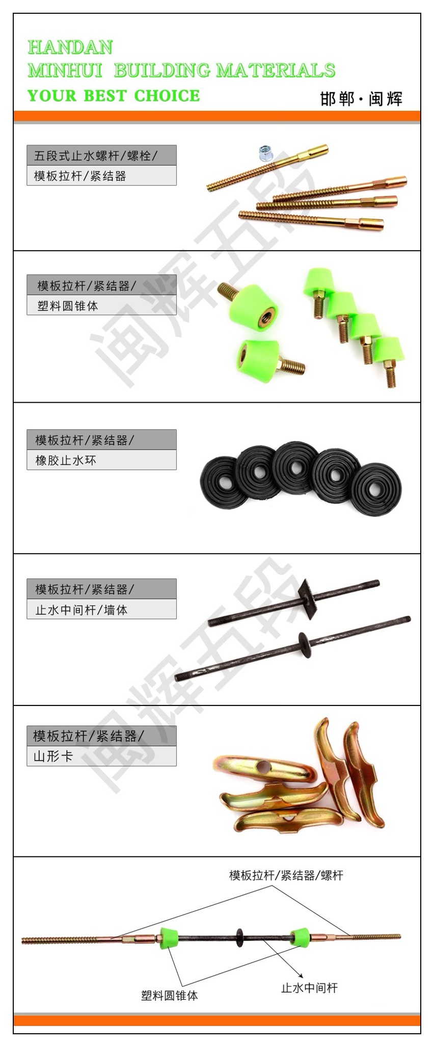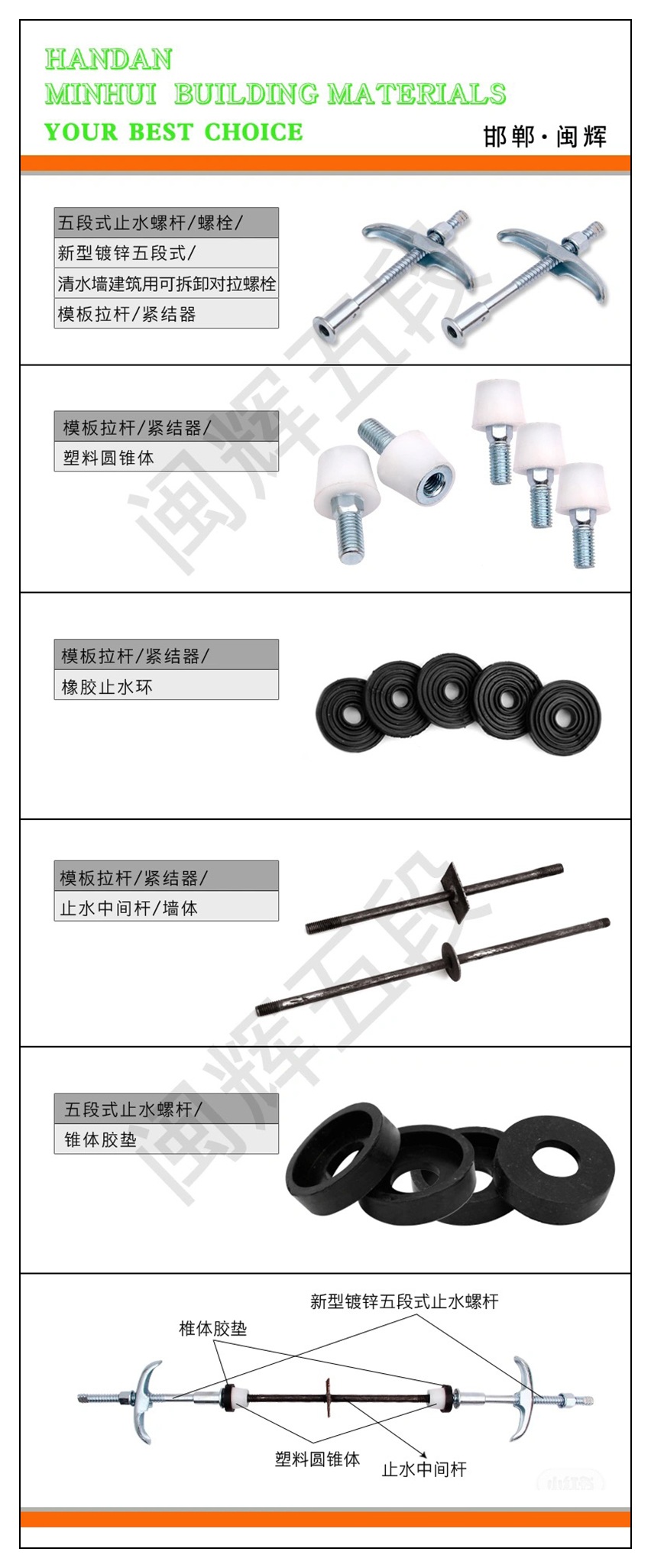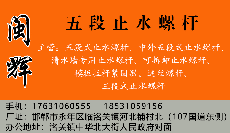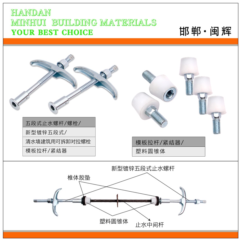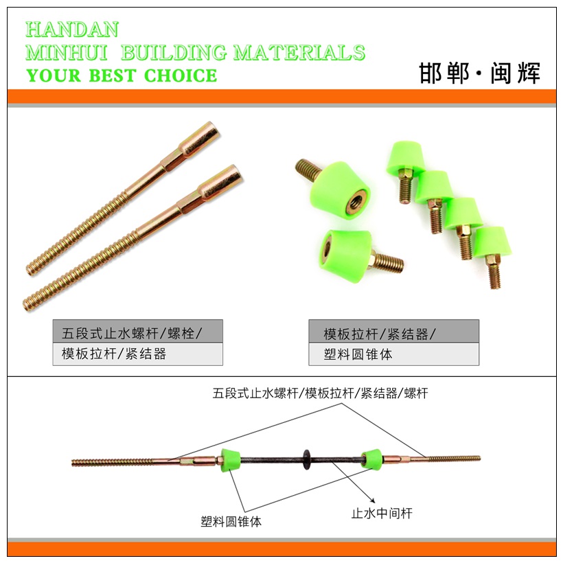 主营:五段式止水螺杆、中外五段式止水螺杆、清水墙专用止水螺杆、可拆卸止水螺杆、模板拉杆紧固器、通丝螺杆、三段式止水螺杆