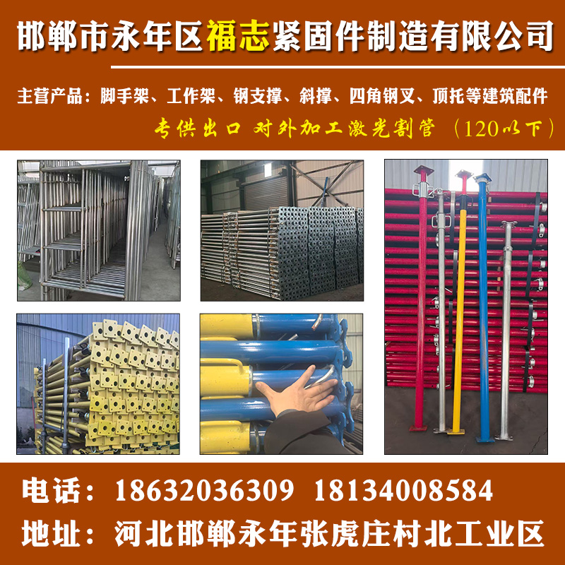 主营产品:脚手架,门式脚手架,梯型脚手架,喷塑脚手架,工作架。钢支撑,中式钢支撑,杯钢支撑,盘扣式钢支撑,后浇带钢支撑,可调节钢支柱,斜支撑,伸缩式斜支撑,PC斜支撑,顶托,底托,角叉,三脚架