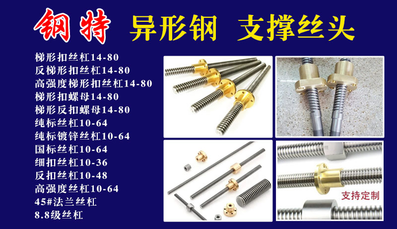 梯形扣丝杠 反梯形扣丝杠 高强度梯形扣丝杠 梯形扣螺母 梯形反扣螺母 纯标丝杠 纯标镀锌丝杠 国标丝杠 细扣丝杠 反扣丝杠 高强度丝杠 45#法兰丝杠 8.8级丝杠 异形钢支撑丝头