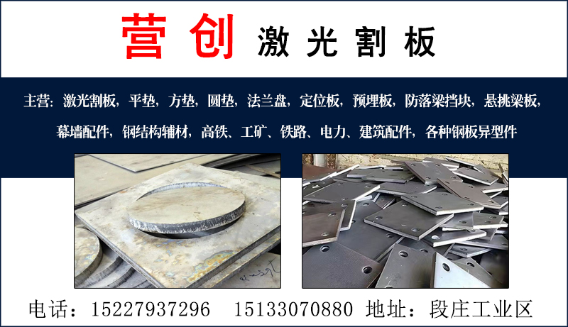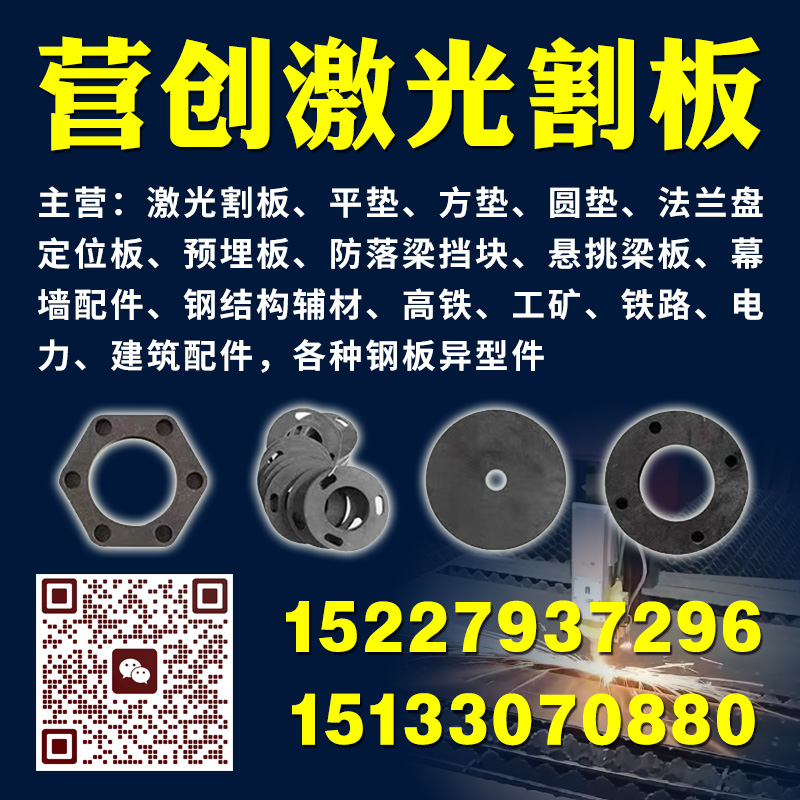 主营:激光割板,平垫,方垫,圆垫,法兰盘,定位板,预埋板,防落梁挡块,悬挑梁板,幕墙配件,钢结构辅材,高铁、工矿、铁路、电力、建筑配件,各种钢板异型件