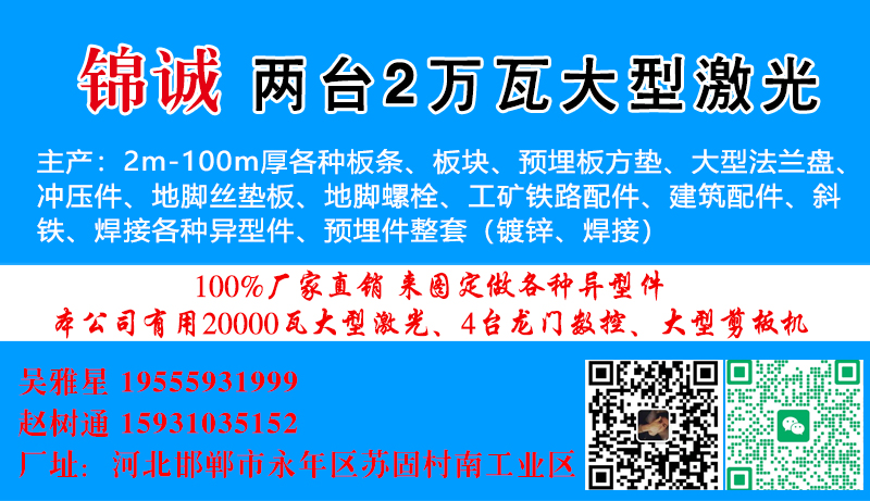 主产:2m-100m厚各种板条、板块、预埋板方垫、大型法兰盘、冲压件、地脚丝垫板、地脚螺栓、工矿铁路配件、建筑配件、斜铁、焊接各种异型件、预埋件整套(镀锌、焊接)