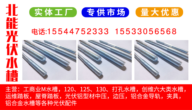北能光伏水槽 主营:工商业M水槽,120、125、130、打孔水槽 创维六大类水槽、运维踏板,屋脊踏板,光伏铝型材中压,边压,铝合金导轨,夹具,铝合金水槽等各种光伏配件 实体工厂! 专供市场!! 价格实惠!!! 手机:15544752333 15533056568 地址:东二环大拳头标志加油站北边路口东行50米路北