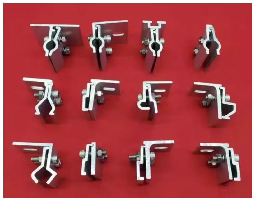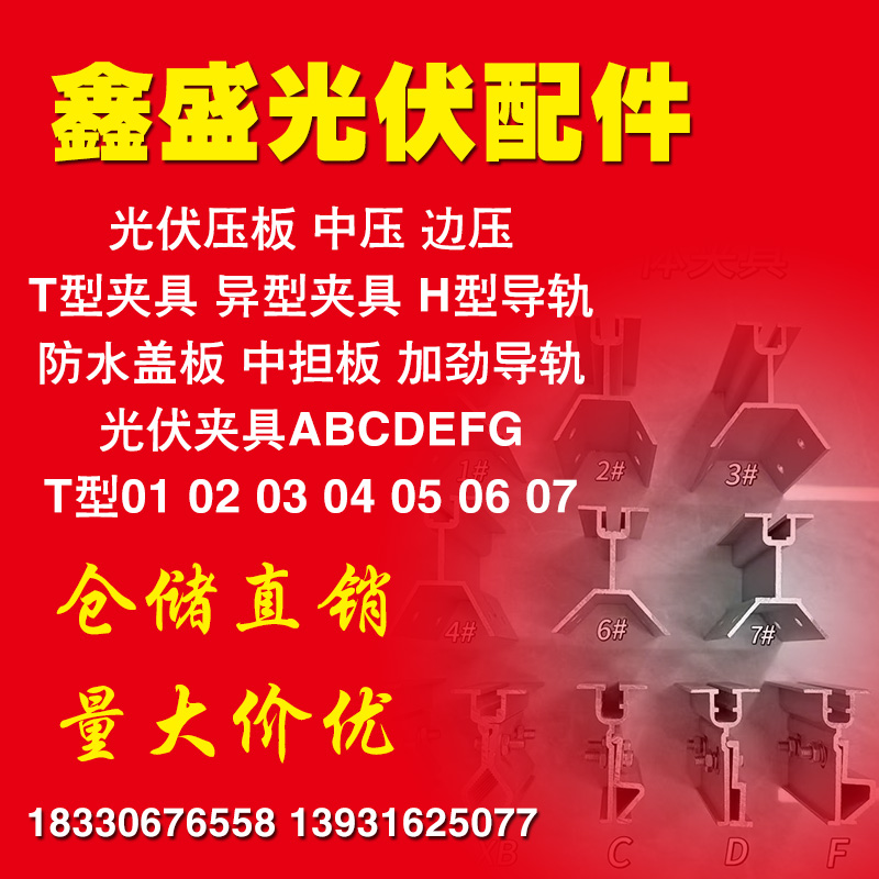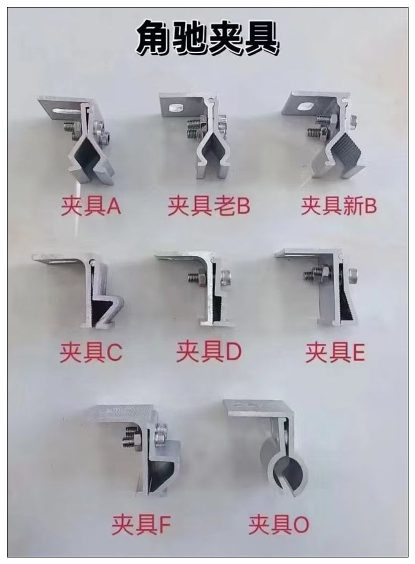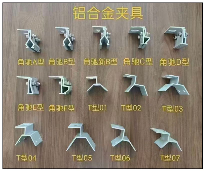 铝合金角驰夹具、T型夹具、万能夹具、一体夹具、铝合金导轨、中压、边压、中托、边托、水槽托架、盘龙压块、契型夹、80组合、挡雪夹、铝合金水槽、铝合金防水盖板、异型压块、中担、边担 、滑块螺母、各种铝合金光伏配件三角、底座、直连接、(锌铝镁、热镀锌)不可调挂钩、单可调挂钩、双可调挂钩、正泰挂钩、小黑瓦挂钩、挂钩挡板、M水槽支撑、地桩底座、各种抱箍、檩托、檩条连接件、抗震80免焊底座、180焊接底座、100焊接底座、平面压板、光伏铝件、角驰夹具等