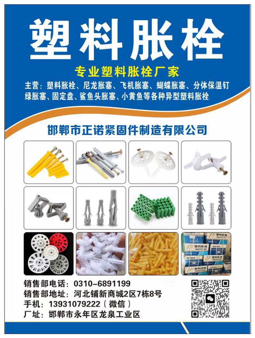 主营 : 塑料胀栓/塑料胀钉,杏黄胀塞,各种包装小黄鱼塑料胀塞,锯齿壁虎(铁胀塞)灰色白色鲨鱼头,电视墙胀塞,木螺丝等产品