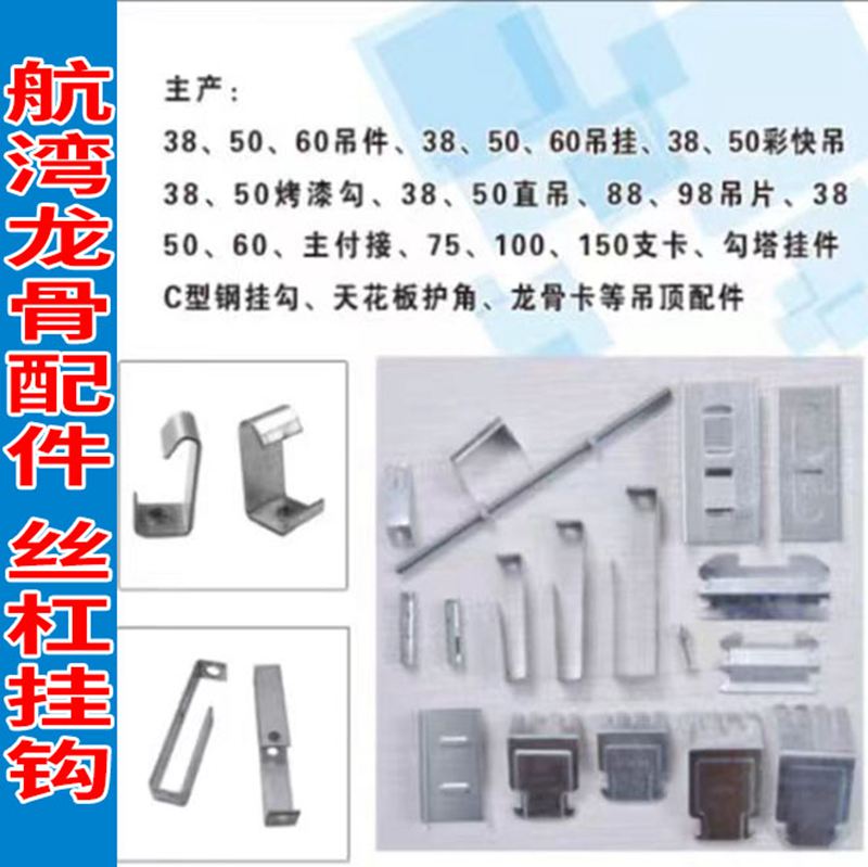 主产:38、50、60吊件、38、50、60吊挂、38、50彩快吊 38、50烤漆勾、38、50直吊、88、98吊片、38 50、 60、主付接、75、100、150支卡、勾塔挂件 C型钢挂勾、天花板护角、龙骨卡等吊顶配件 丝杠配件 瓷砖调平、瓷砖找平 瓷砖调平器