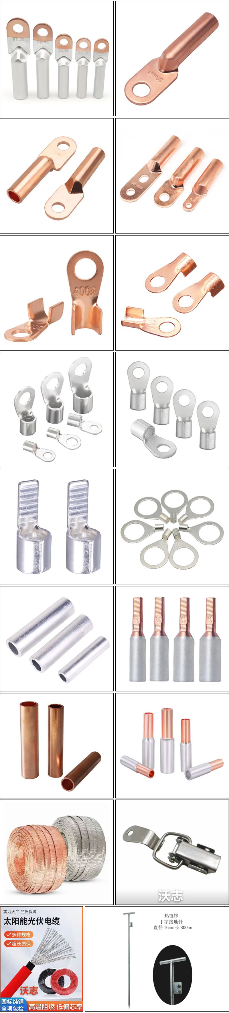 自产自销:光伏 电力器材,铜鼻子、SC、DT、RV、插针、c45、热缩管五指套、幕墙接地线、法兰接地线、 接地卡、接地针、光伏直流线、光伏导电片、光伏接地线、双色接地线、编织接地线、桥架螺丝、接地端子、不锈钢连接线、高铁 隧型 路基型接地端子、高铁连接线、不锈钢防盗螺丝、七字扣、免焊扣、接地垫、拉爆、丝杆、一体钉、三角牙螺丝、螺母、铜包铜、铜包铝、铜包锡,五指套,热缩终端,冷 热缩管,2.5平方到50平方之间都可定做双色线/打圈线。缠绕膜