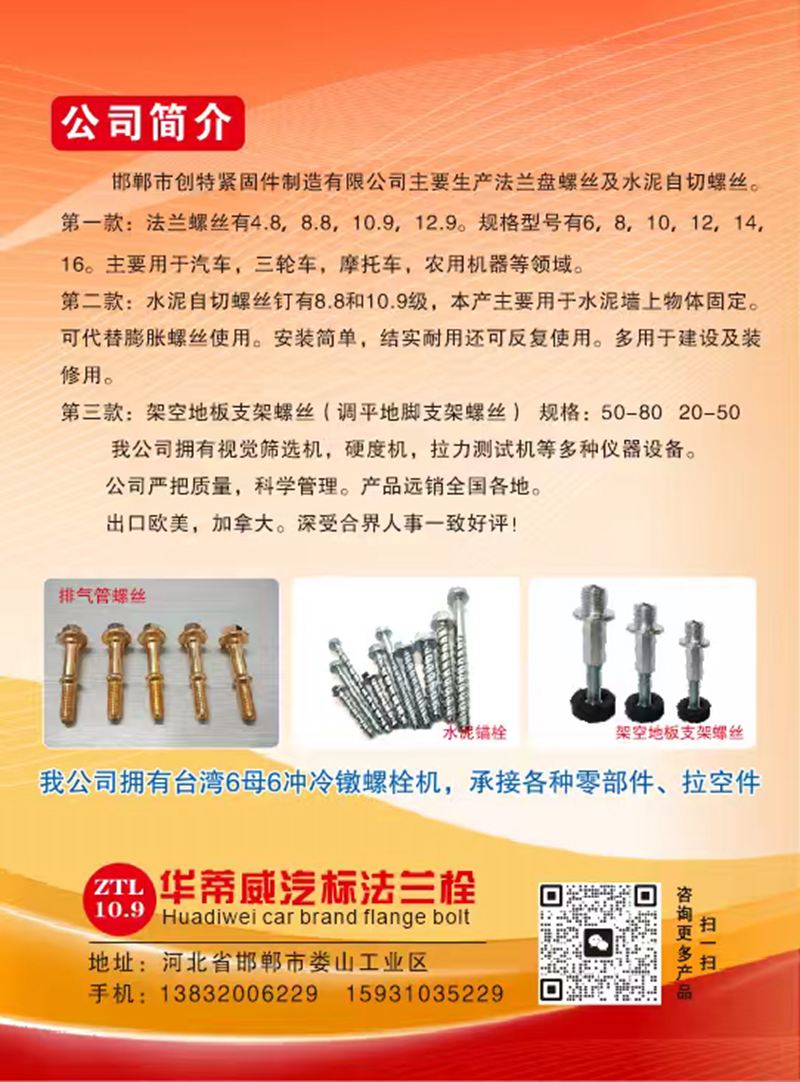 4.8法兰栓、8.8法兰螺钉、10.9法兰螺丝、12.9级高强度法兰栓、细扣法兰螺栓、美制扣法兰栓、英制扣法兰栓、8.8级法兰栓、10.9级法兰螺丝、加长法兰面外六角螺栓、镀彩法兰栓、镀锌法兰栓、高强度法兰螺丝、六角法兰面螺栓、自切锚栓、水泥锚栓、排气管螺丝、气标螺丝