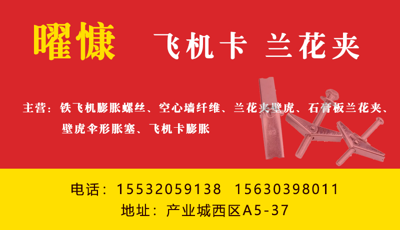 主营:铁飞机膨胀螺丝、空心墙纤维、兰花夹壁虎、石膏板兰花夹、壁虎伞形胀塞、飞机卡膨胀