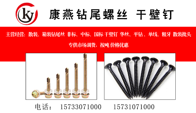 主营经营:散装钻尾丝 箱装钻尾丝 非标钻尾丝 中标钻尾丝 国标钻尾丝 干壁钉 华司钻尾丝 沉头钻尾丝 平钻钻尾丝 单线钻尾丝 粗牙钻尾丝 散装批头