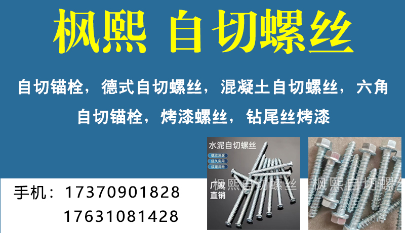 主营:膨胀自攻丝,不锈钢自切,角码螺丝,纱窗螺丝,细牙防滑钻尾丝,英制沉杯螺丝拉、爆胖胀螺丝,吊顶自切螺丝,轻钢龙骨胖头钉,小蜜蜂螺丝。