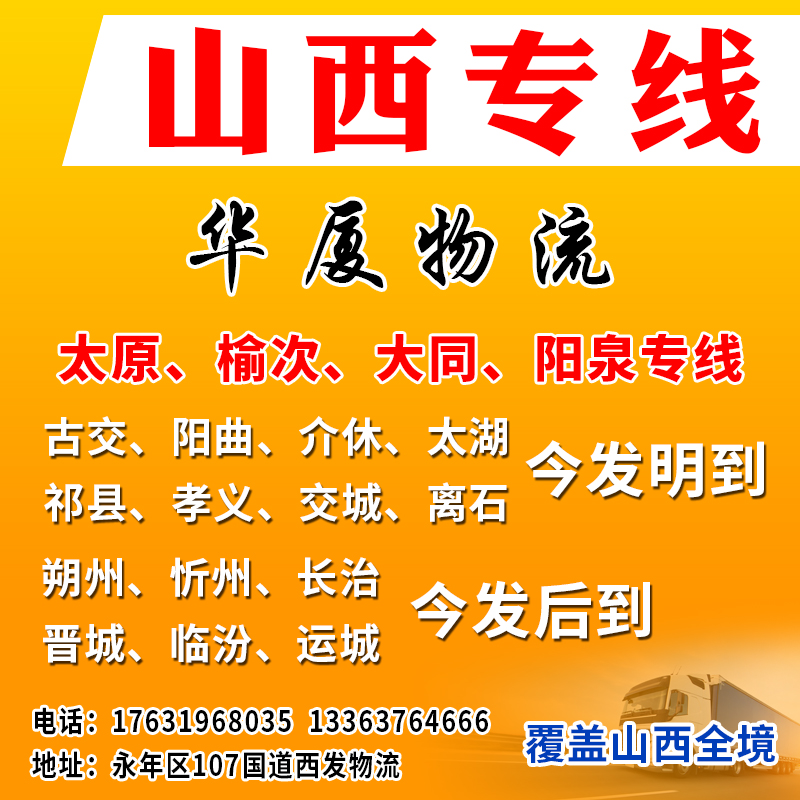 太原 榆次 大同 阳泉专线 古交、阳曲、介休、太湖、祁县、孝义、交城、离石 今发明到 朔州、忻州、长治、晋城、临汾、运城 今发后到 覆盖山西全境 电话:18263567760 13363764666
