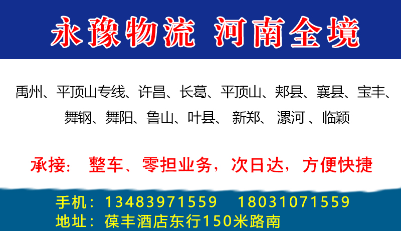 禹州、平顶山专线、许昌、长葛、平顶山、郏县、襄县、宝丰、舞钢、舞阳、鲁山、叶县、 新郑、 漯河 、临颖