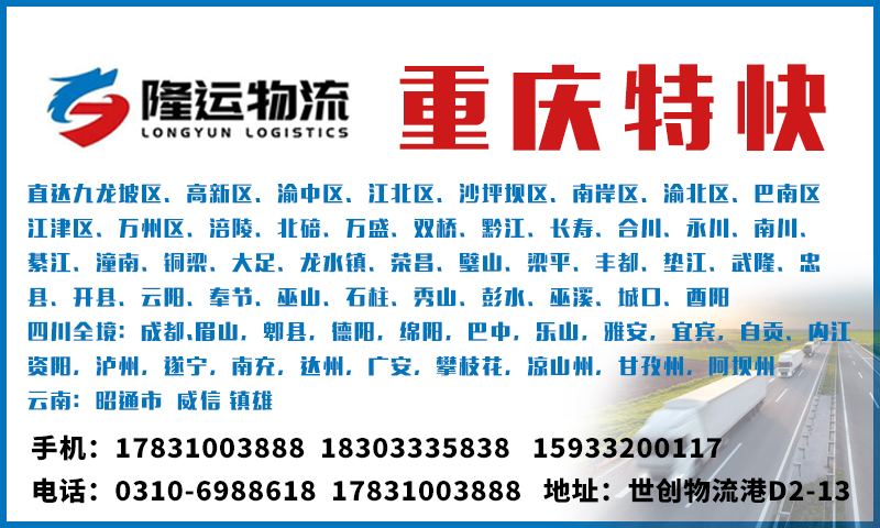 直达九龙坡区、高新区、渝中区、江北区、沙坪坝区、南岸区、渝北区、巴南区、江津区、万州区、涪陵、北碚、万盛、双桥、黔江、长寿、合川、永川、南川、綦江、潼南、铜梁、大足、龙水镇、荣昌、璧山、梁平、丰都、垫江、武隆、忠县、开县、云阳、奉节、巫山、石柱、秀山、彭水、巫溪、城口、酉阳