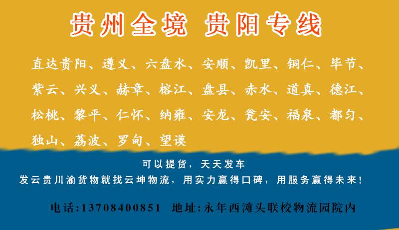 直达贵阳、遵义、六盘水、安顺、凯里、铜仁、毕节、紫云、兴义、赫章、榕江、盘县、赤水、道真、德江、松桃、黎平、仁怀、纳雍、安龙、瓮安、福泉、都匀、独山、荔波、罗甸、望谟 可以提货,天天发车 发云贵川渝货物就找云坤物流,用实力赢得口碑,用服务赢得未来!